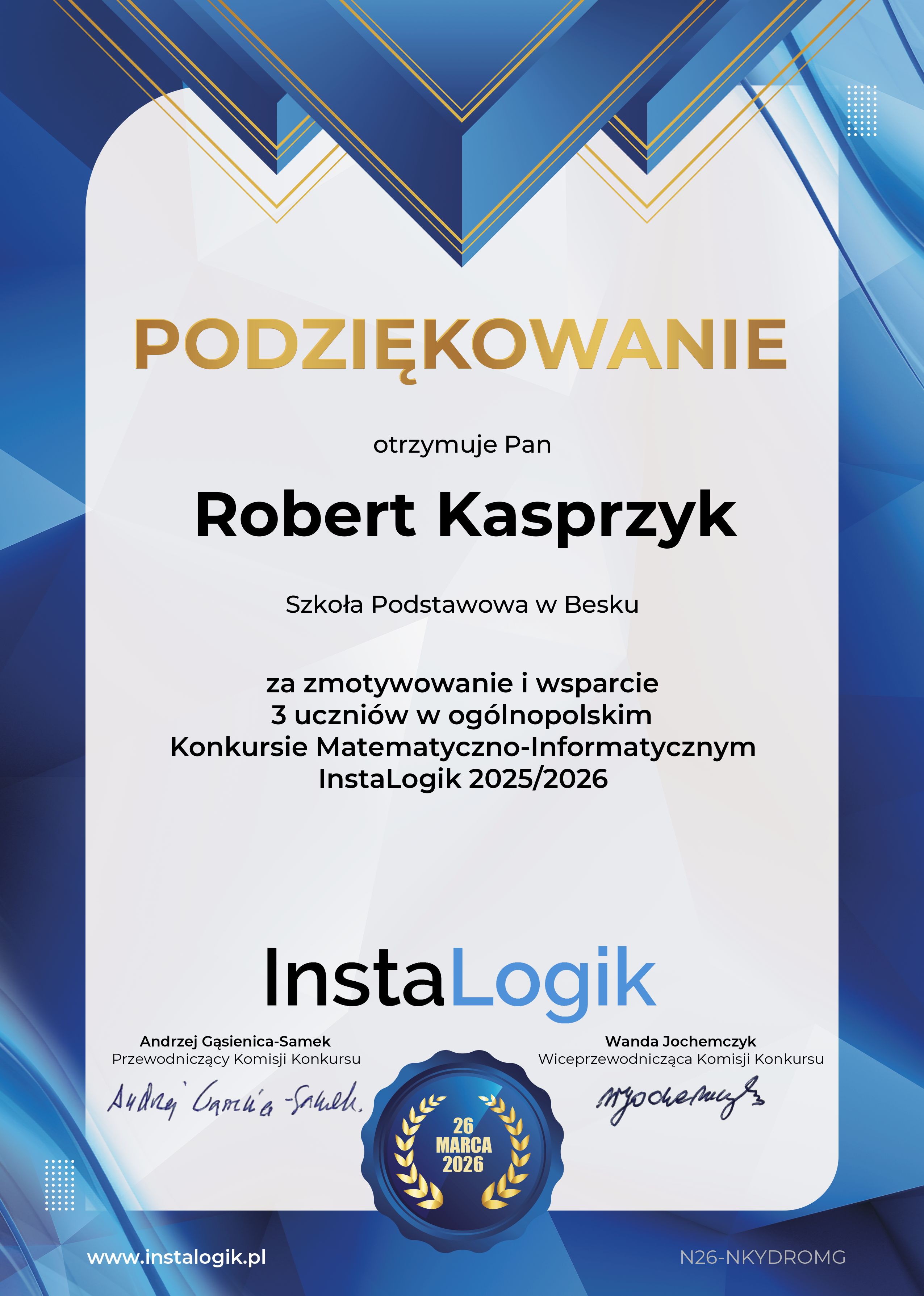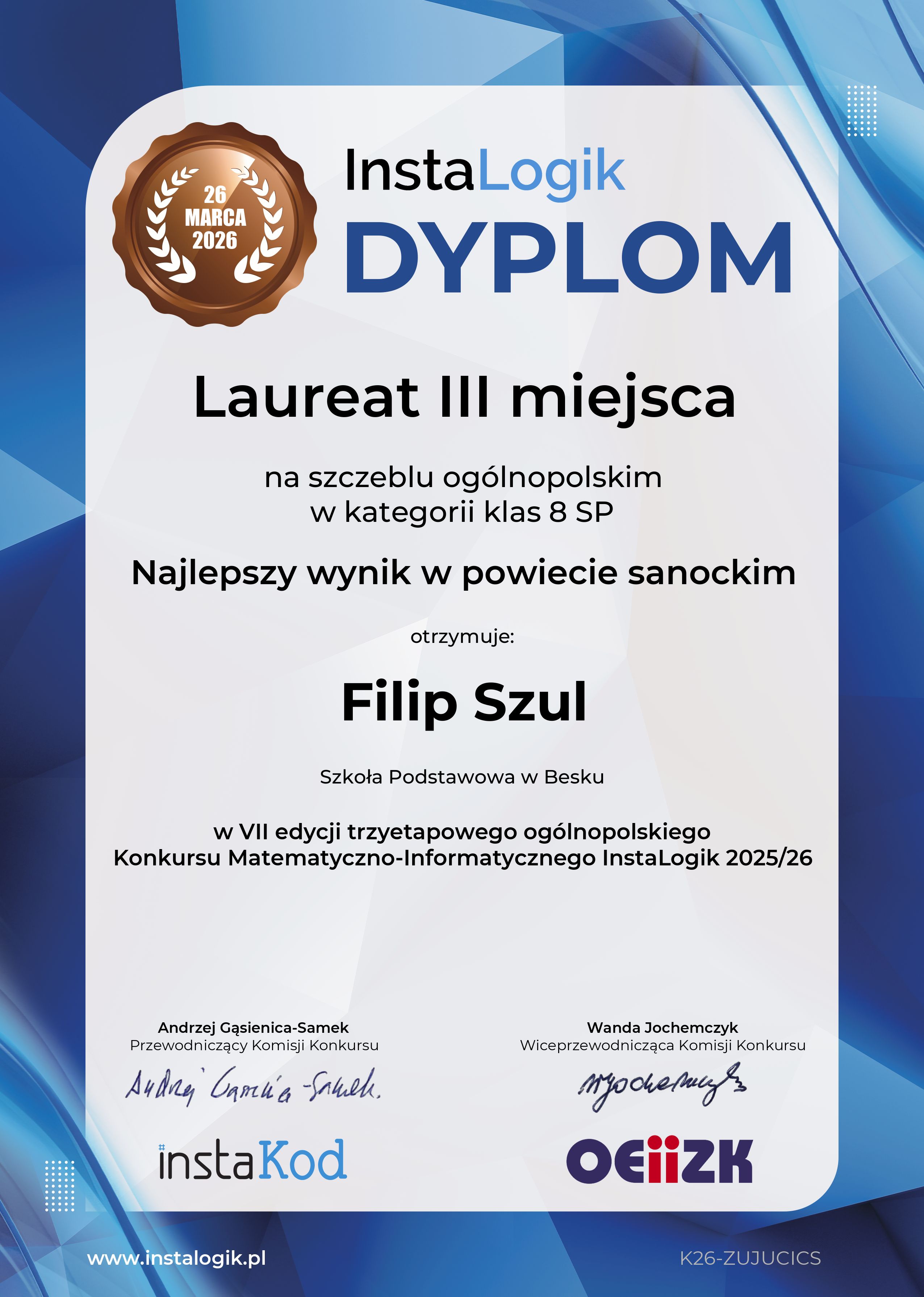 Filip Szul uczeń klasy 8b został laureatem trzyetapowego ogólnopolskiego konkursu InstaLogik. w kategorii klas 8. InstaLogik to popularyzatorski konkurs matematyczno-informatyczny dla uczniów klas 4-8 SP.Celem konkursu jest zachęcenie uczniów do zmierzenia się z zadaniami logicznymi oraz prostymi zadaniami programistycznymi, które wprowadzają uczniów w świat programowania. W ogólności jego celem jest rozwijanie zainteresowań matematycznych i programistycznych młodzieży oraz propagowanie myślenia komputacyjnego.