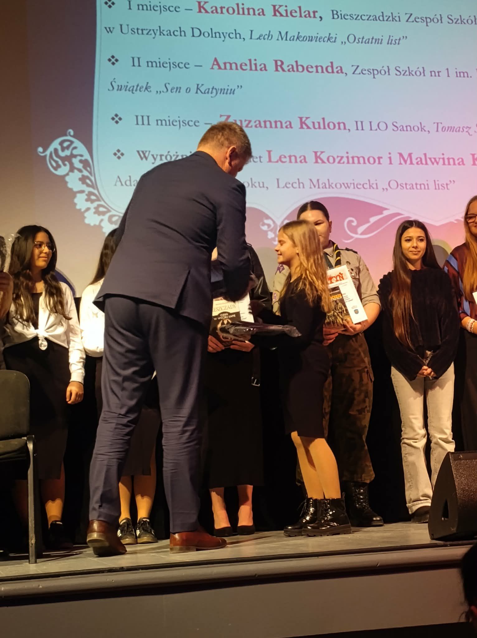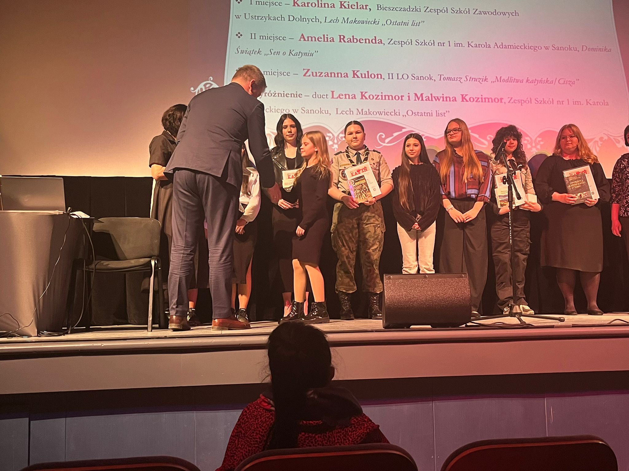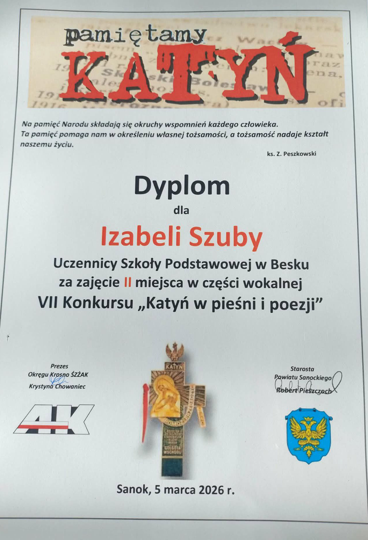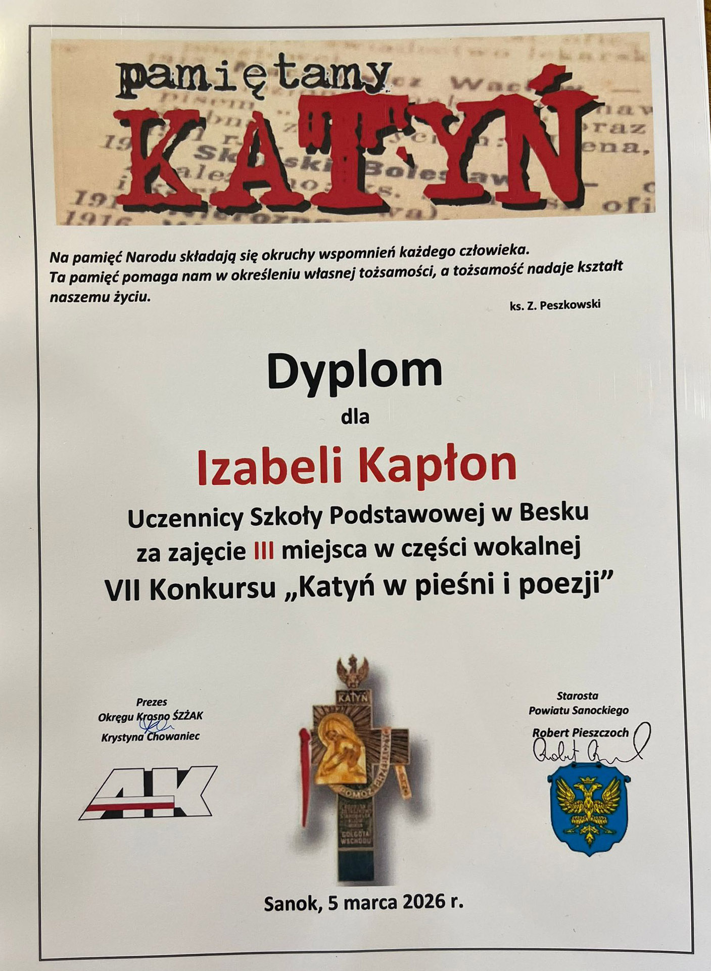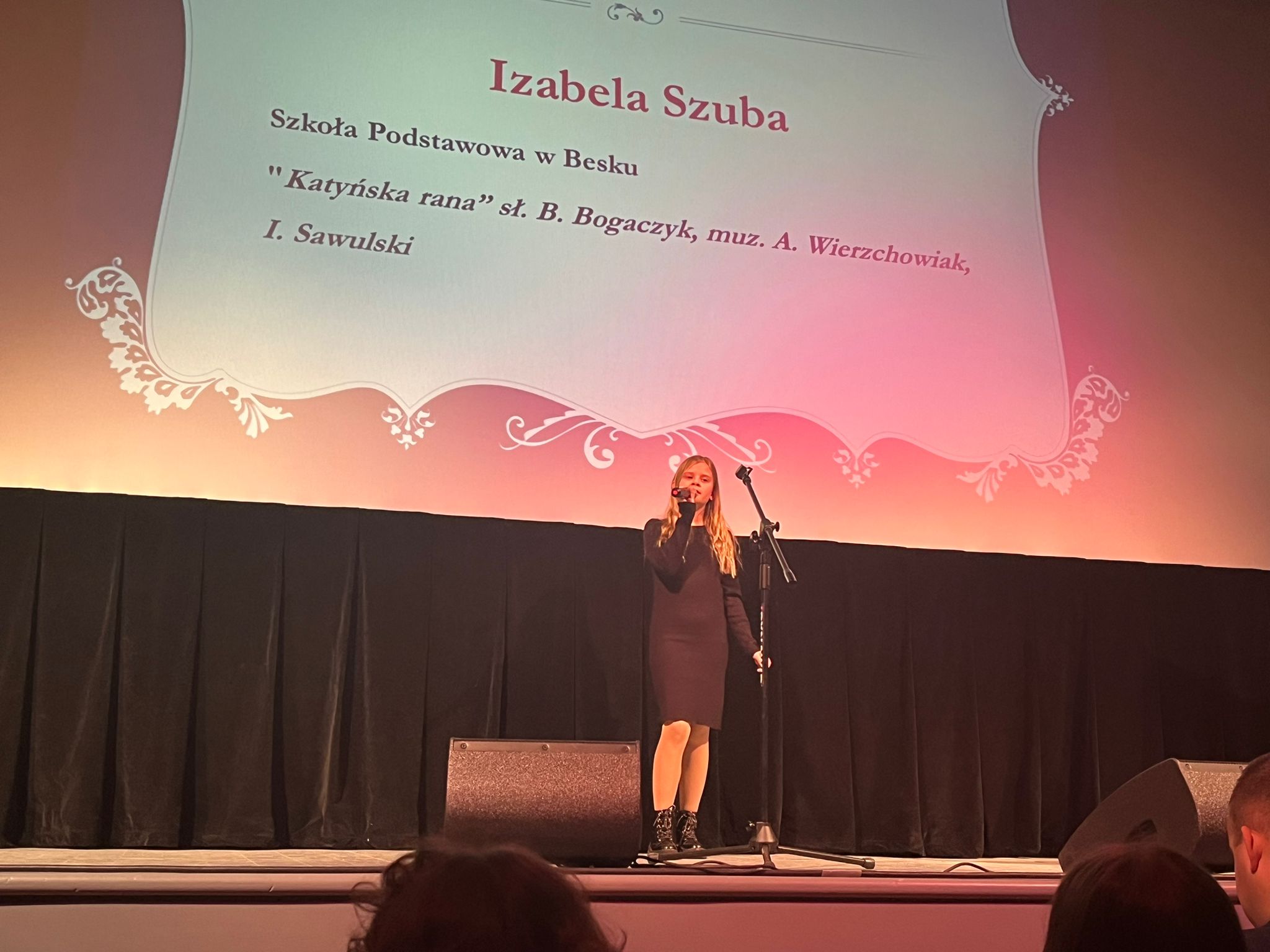W ostatnich dniach odbył się w Sanoku konkurs pt. Katyń w pieśni i poezji, którego celem jest pielęgnowanie pamięci o tych którzy zginęli w Katyniu. W konkursie wzięły udział trzy uczennice z naszej szkoły tj. Izabela Kapłon, Rozalia Jaślar z klasy 6 i Izabela Szuba z klasy 4. Dziewczynki pięknie wykonały przygotowane piosenki i zajęły wysokie miejsca.