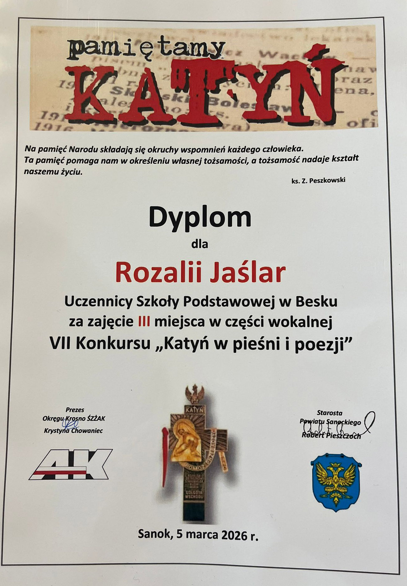 W ostatnich dniach odbył się w Sanoku konkurs pt. Katyń w pieśni i poezji, którego celem jest pielęgnowanie pamięci o tych którzy zginęli w Katyniu. W konkursie wzięły udział trzy uczennice z naszej szkoły tj. Izabela Kapłon, Rozalia Jaślar z klasy 6 i Izabela Szuba z klasy 4. Dziewczynki pięknie wykonały przygotowane piosenki i zajęły wysokie miejsca.